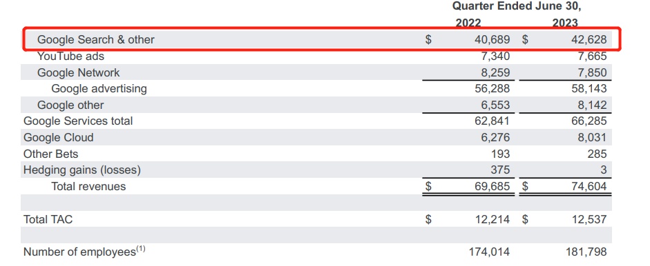 当ChatGPT以极快的用户增速席卷全球时,全世界都在担心搜索引擎巨头谷歌将遭受重创,毕竟对于人类社会发展具有革命性意义的ChatGPT可谓直击谷歌的“赚钱机器”,此前谷歌从未遇到过如此颠覆搜索行业的竞争对手。然而,自第一季度以来,Alphabet旗下谷歌的搜索业务表现良好,继第一季度搜索营收在ChatGPT重压下实现小幅增长后(1.9%),Q2谷歌搜索引擎为Alphabet带来的营收达到426亿美元,同比增长近5%,高于分析师预期的422亿美元。