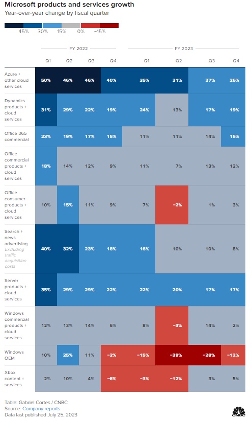 目前,微软已经为公司的大多数主要产品线推出了一系列基于合作伙伴OpenAI模型的新人工智能项目,对允许客户使用OpenAI技术的基于互联网的服务需求也正在激增。尽管如此,该公司包括人工智能在内的Office办公套件尚未广泛使用,在几年的企业投资不断增加后,Azure服务和Office应用程序的总体支出正在减少。与此同时,PC出货量连续第六季度下降,侵蚀了Windows软件和Surface设备的销量。