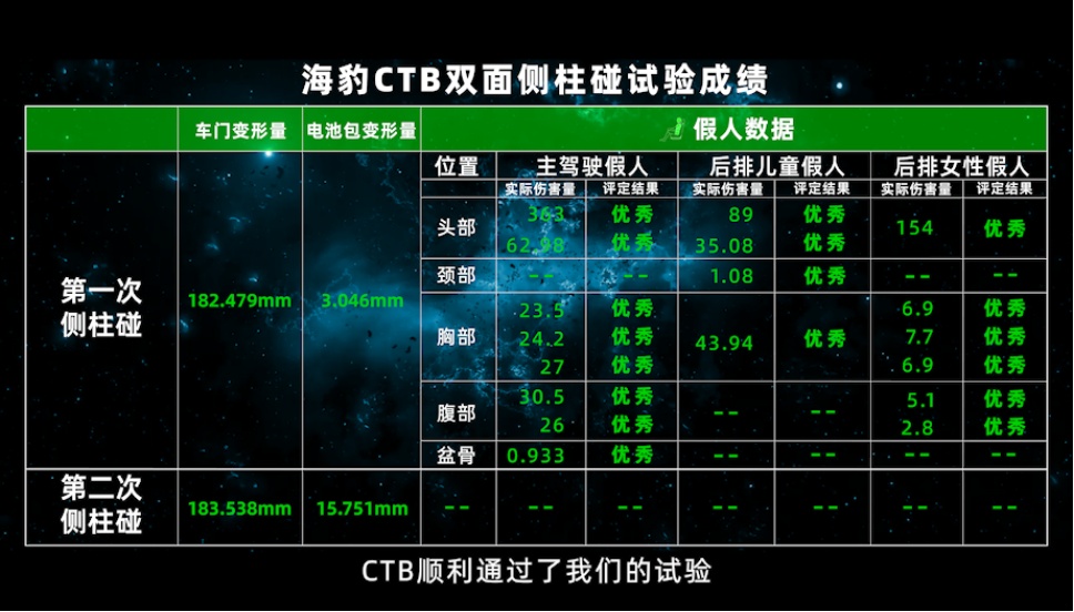 搭载CTB电池车身一体化技术的比亚迪海豹在TOP Safety双面侧柱碰试验中,挑战了主驾驶侧柱碰试验,副驾驶后排侧柱碰试验,以及两次侧柱碰后的电池包复用试验,顺利通过了挑战。