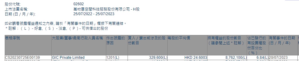 智通财经APP获悉,香港联交所最新资料显示,7月20日,GIC Private Limited减持万物云(02602)32.96万股,每股作价24.6003港元,总金额约为810.83万港元。减持后最新持股数目为876.21万股,最新持股比例为6.84%。