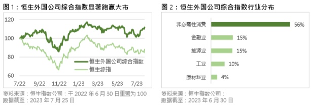 恒指公司指出,对外国公司的投资气氛亦受到环球复苏及商贸重启的提振,恒生外国公司综合指数反映在港上市的外国公司之整体表现,7月以来升逾9%(图1,截至2023年7月25日),带动年初至今变幅重返正数。此指数不仅短线跑赢以恒生综合指数(“恒生综指”)为代表的大市,长线表现同样优异,过去三年录得53%涨幅,对比大市则见21%跌幅。恒生外国公司综合指数在2011年9月推出,1年年化波动率为23.3%(恒生综指:27.5%),相对大市为低,而股息率则高于大市,达5.7%(恒生综指:3.4%)。截至2023年7月25日,指数的11只成份股中共有4只符合南向交易的资格。至于行业分布方面,截至6月底非必需性消费为指数的最大行业,比重高达56%(图2),其后则是金融业和能源业。