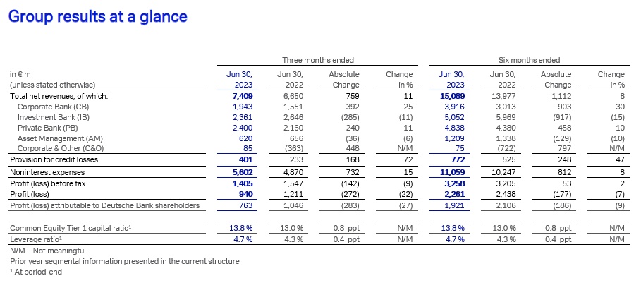 智通财经APP获悉,7月26日,德意志银行(DB.US)公布了2023年第二季度财务业绩。财报显示,德银Q2净营收为74.09亿欧元,同比增长11%。归属于公司股东的净利润为7.63亿欧元,同比下降27%。信贷损失准备金为4.01亿欧元,同比增长72%。非利息支出为56.02亿欧元,同比增长15%,高于分析师预期,其中包括遣散费和诉讼费用。