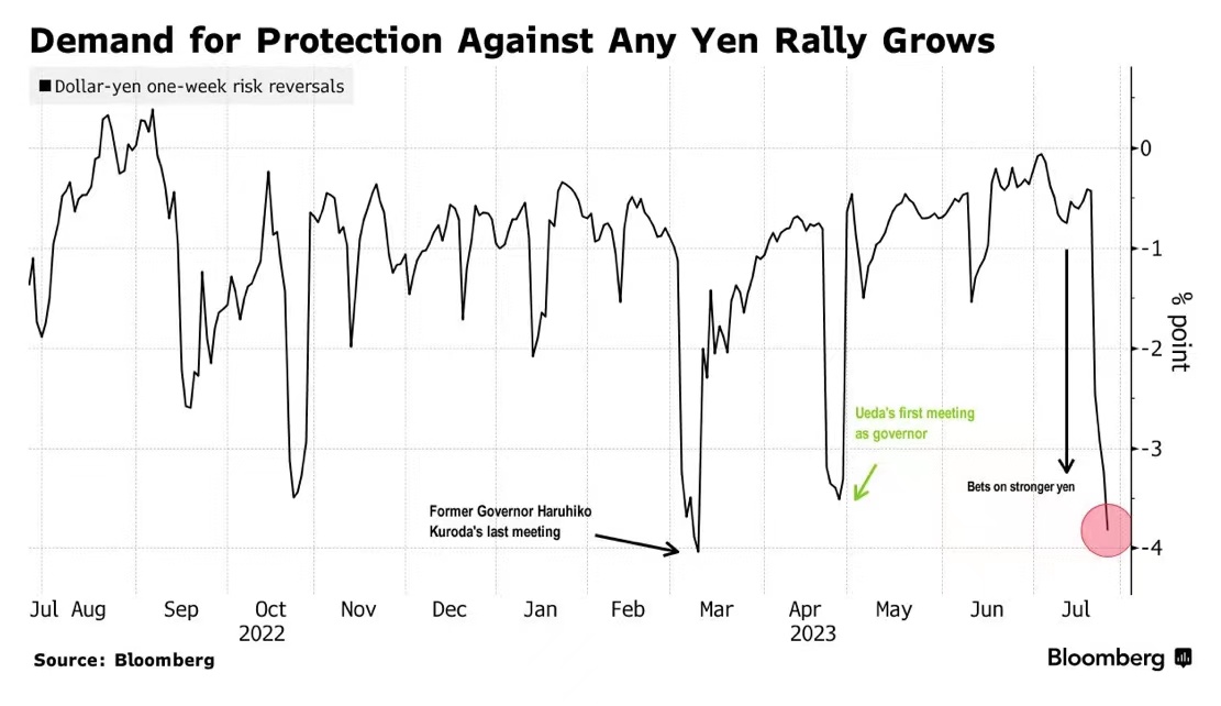 期权市场的信号显示,交易员对日本央行采取任何收紧宽松政策的措施感到紧张,这是日元兑美元跌至近八个月低点的关键驱动因素。尽管日本央行行长植田和男表示,由于日本央行距离实现通胀目标还有一段路要走,他将坚持宽松政策,但交易员仍处于紧张状态。