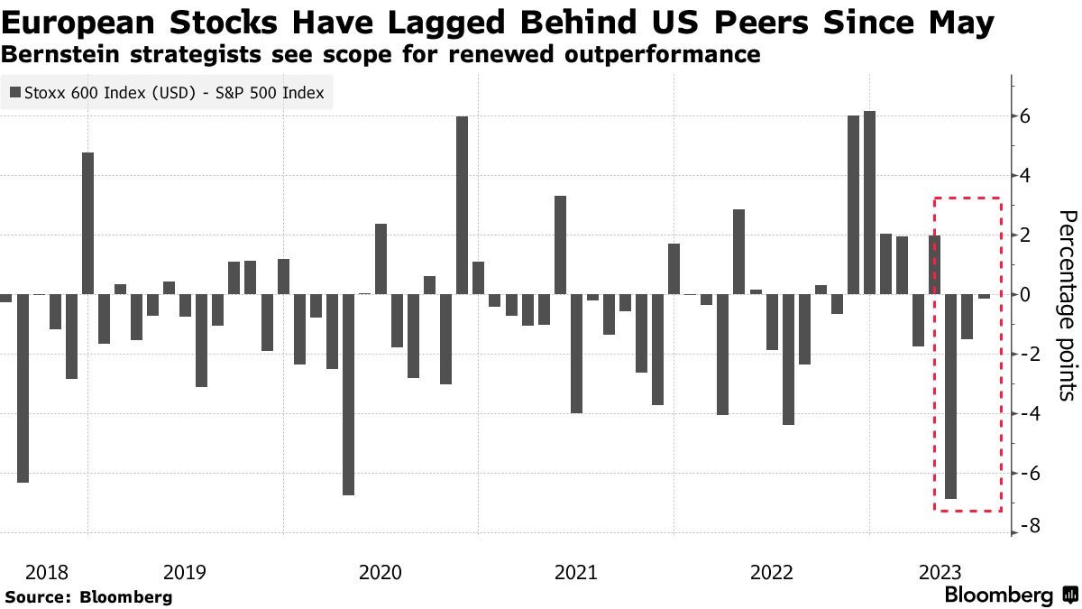 尽管欧洲股市的表现逊于受人工智能热潮提振的美国股市,但Bernstein是最新一批更加看好欧洲股市前景的公司之一。花旗集团策略师Beata Manthey本月早些时候表示,现在到了买入欧洲股票的时候了,因为相对于美国股票,目前的欧洲股票是有史以来最便宜的。