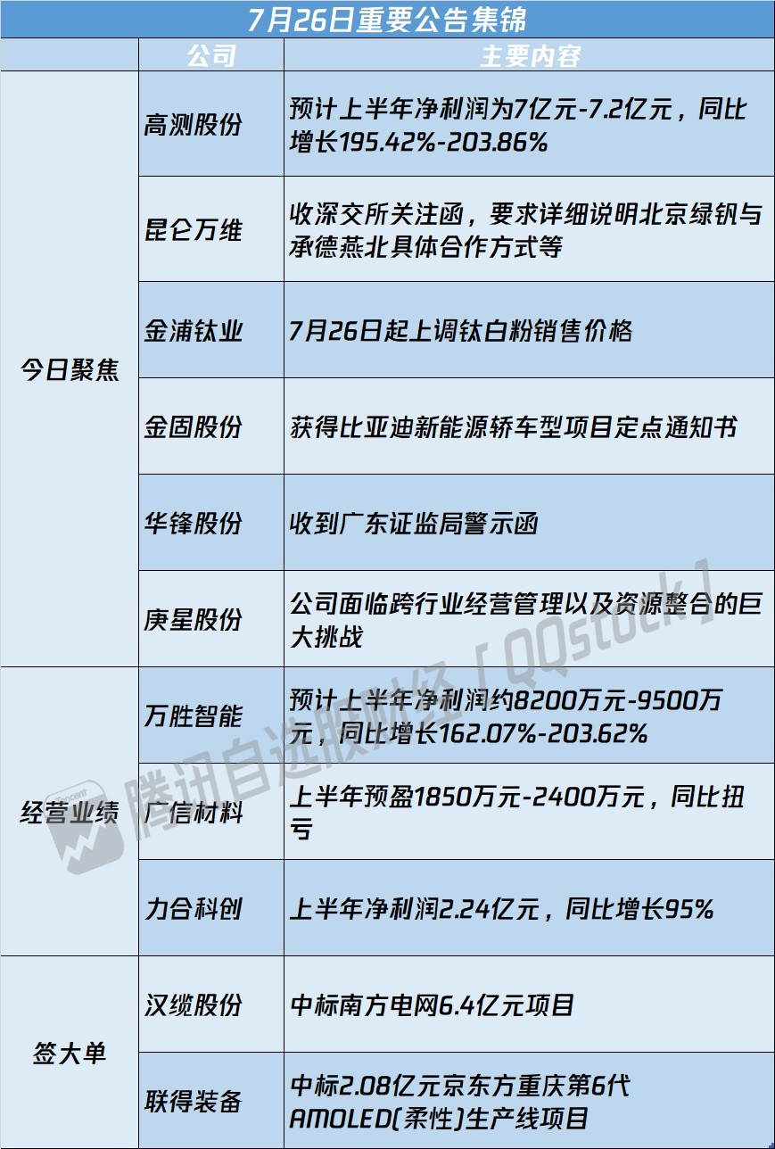 1、高测股份:预计上半年净利润为7亿元-7.2亿元,同比增长195.42%-203.86%