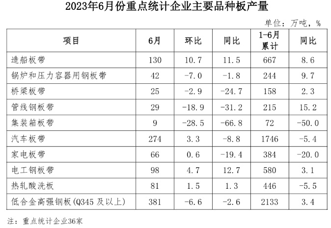 智通财经APP获悉,7月26日,中国钢铁工业协会指出,2023年6月,重点统计企业主要品种板中,造船板和电工钢板产量同比增幅较大,集装箱板、管线钢板和桥梁板产量同比降幅较大。