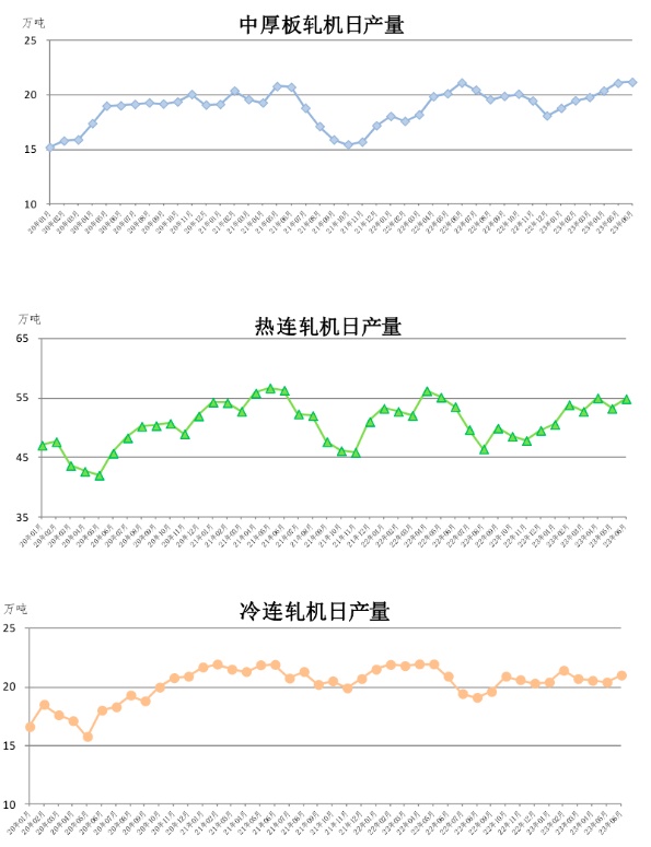 2023年6月,中厚板轧机生产637万吨,同比上升0.5%;热连轧机生产1648万吨,同比上升2.4%;冷连轧机生产629万吨,同比上升0.2%。2023年6月,中厚板轧机日产21.2万吨,环比上升0.5%,同比上升0.3%;热连轧机日产54.9万吨,环比上升3.0%,同比上升2.4%;冷连轧机日产21.0万吨,环比上升2.9%,同比上升0.5%。