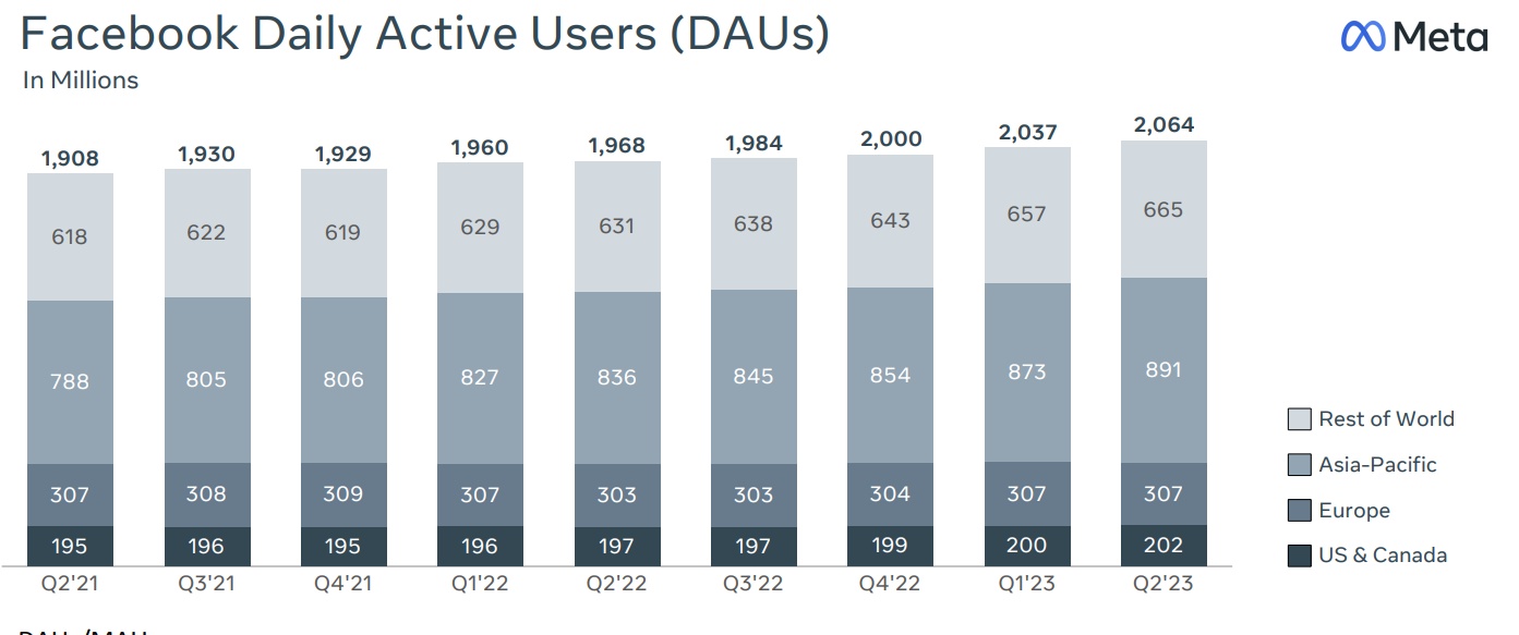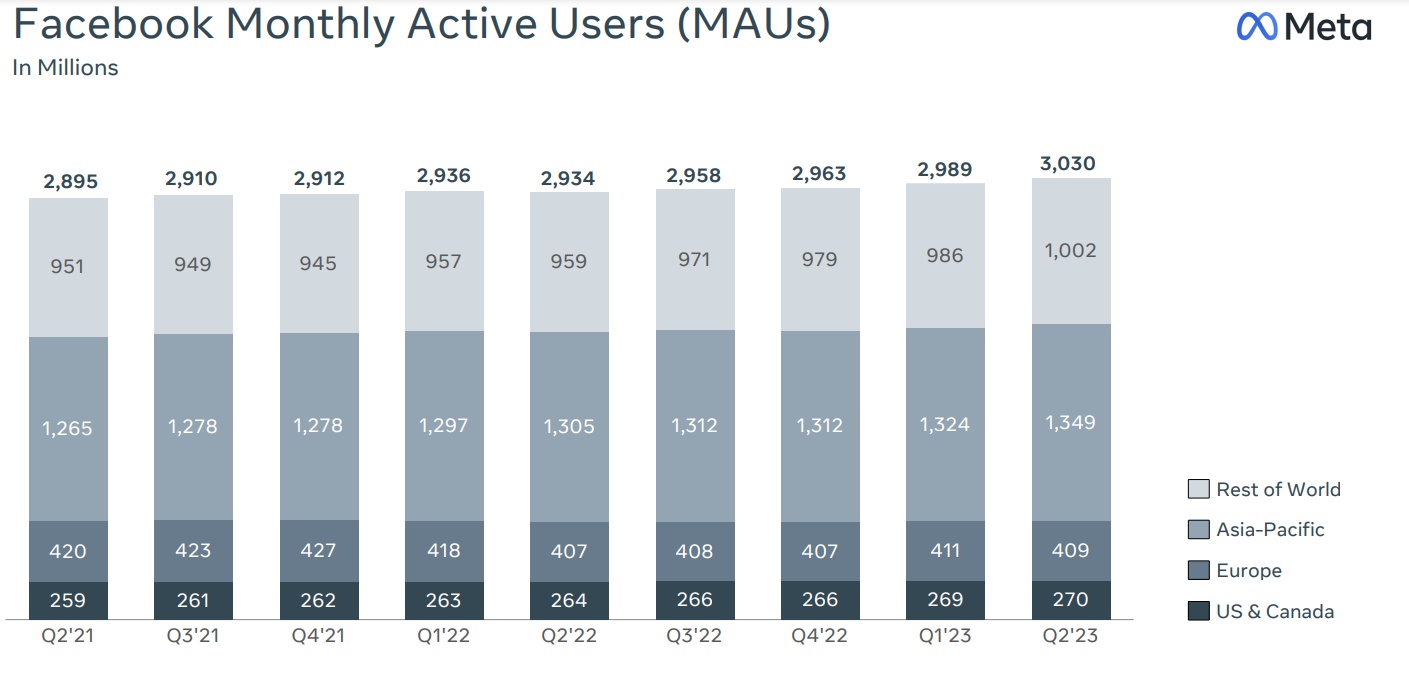 在去年四季度,Facebook的每日活跃用户数(DAU)史上首次达到20亿,此后一再创新高,在第二季度DAU则达到20.64亿,刷新一季度所创的单季最高纪录。第二季度Facebook的月度活用户数(MAU)则为史上首次突破30亿大关,达到30.3亿,高于分析师预期的30亿整。