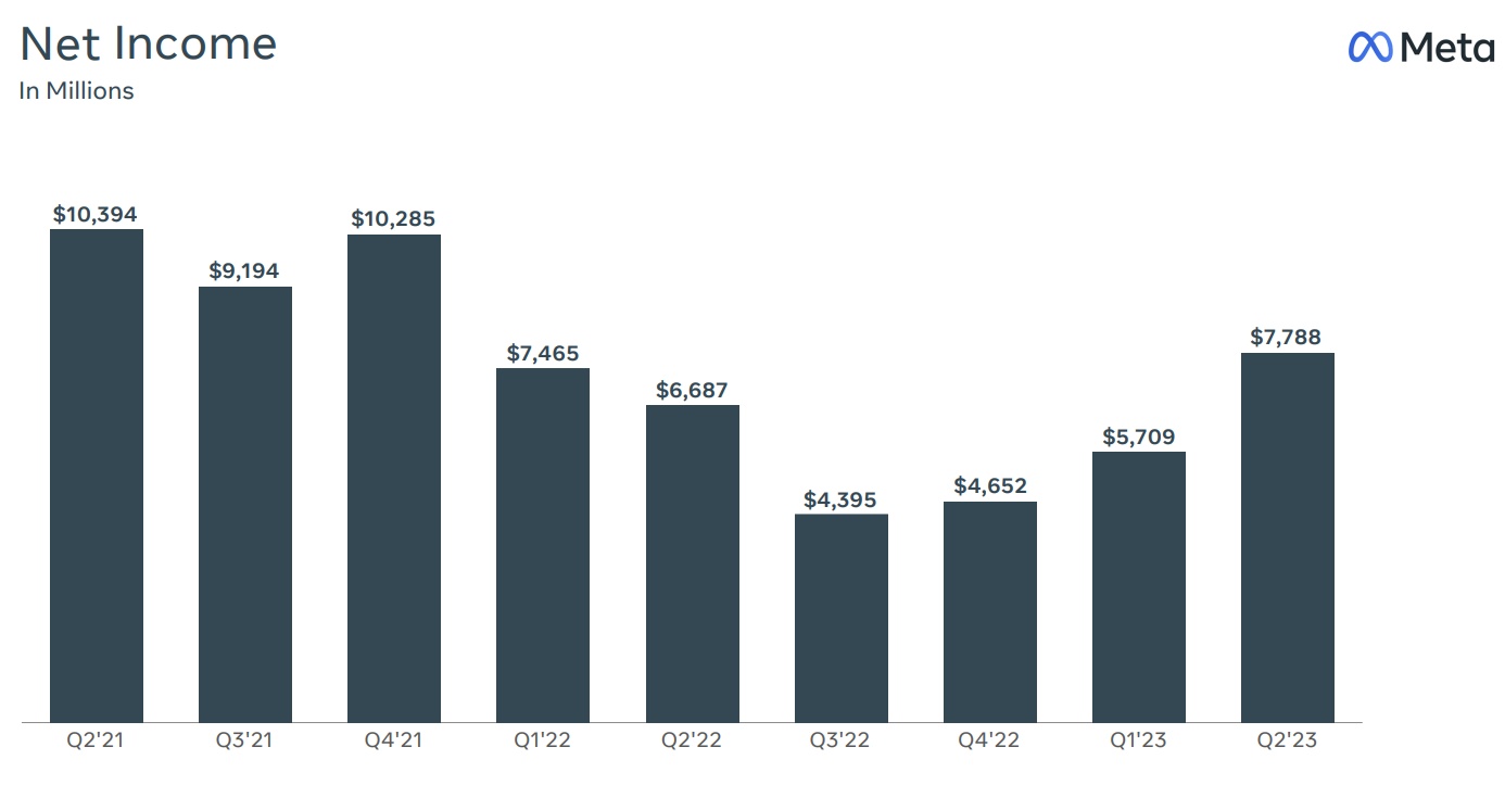 Meta第二季净利润约为78亿美元,合每股收益2.98美元,超过分析师平均预期的每股2.92美元,该公司净利润已经呈现出明显的回升态势,目前净利润水平已经超过2022年第一季度。Meta第二季度每股收益(EPS)不但如分析师们所料大幅扭转下降势头,而且增速更迅猛,2.98美元EPS创一年多来新高。