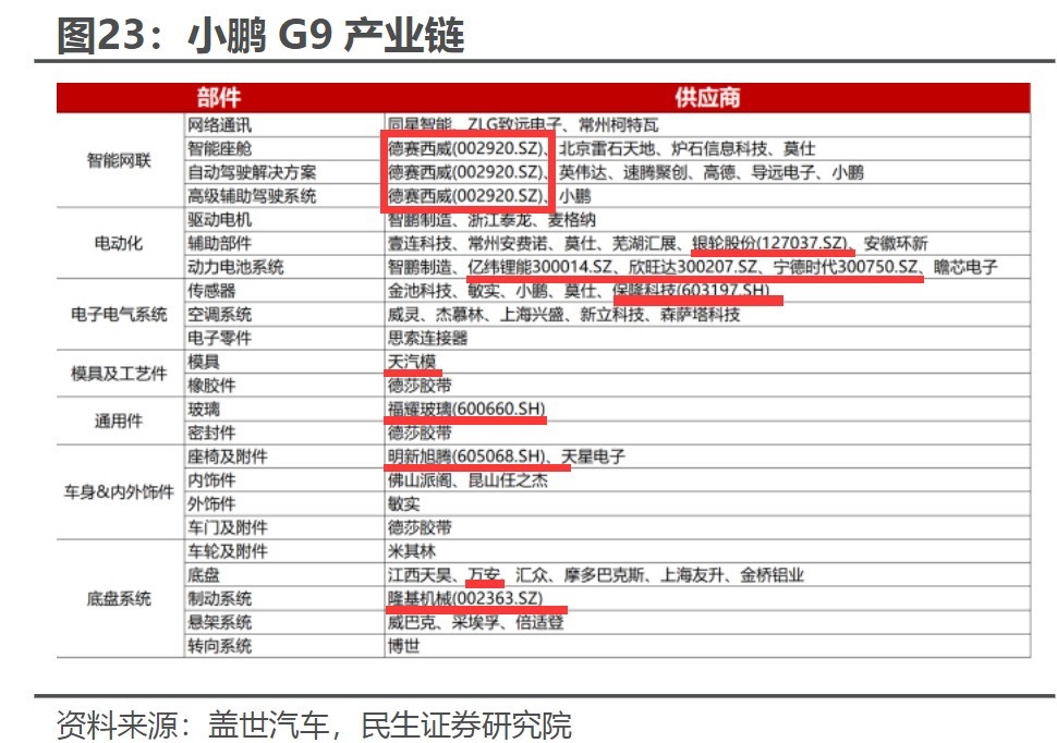 据民生证券梳理的小鹏G9产业链显示,智能座舱的德赛西威;电动化辅助部件的银轮股份;电池的亿纬锂能、欣旺达、宁德时代;传感器的保隆科技;模具的天汽模;玻璃的福耀玻璃;座椅的明新旭腾;底盘的万安科技;制动的隆基机械等涉及。