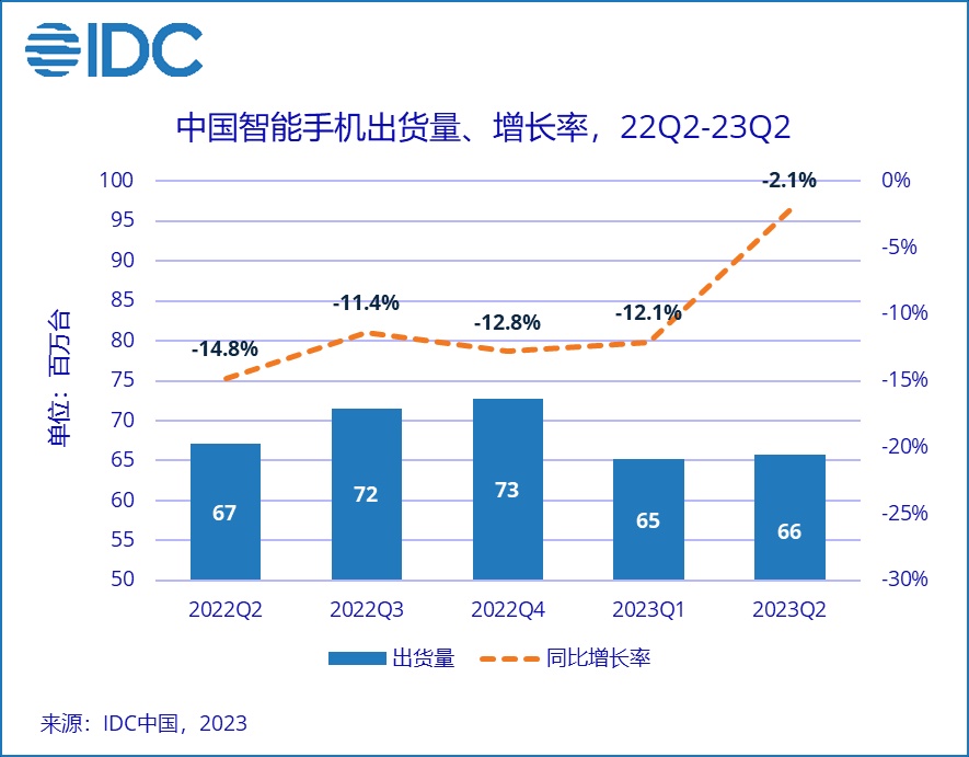 智通财经APP获悉。7月27日,IDC发布手机季度跟踪报告显示,2023年第二季度,中国智能手机市场出货量约6,570万台,同比下降2.1%,降幅明显收窄。上半年出货量约1.3亿台,同比下降7.4%。值得注意的是,整个“618”年中大促期间,在厂商与电商平台双重优惠补贴,且力度较大的情况下,智能手机销售同比下降幅度仍超过5%,消费者需求持续低迷。目前来看,基础的消费者需求尚未恢复,因此厂商以及供应链上游的出货量也不会有明显改观。中国智能手机市场依然处于低谷,市场情况未见好转。
