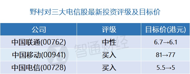 智通财经APP获悉,野村发布研究报告称,下调三大内地电信股目标价。根据工信部数据,内地电信业服务收入于第二季持续放缓,上半年同比增长6.2%,意味着6月份同比增长3.6%,相对于首五个月同比增长6.8%。上半年有线宽带服务和数据流量服务收入各同比增长6.3%及0.2%。