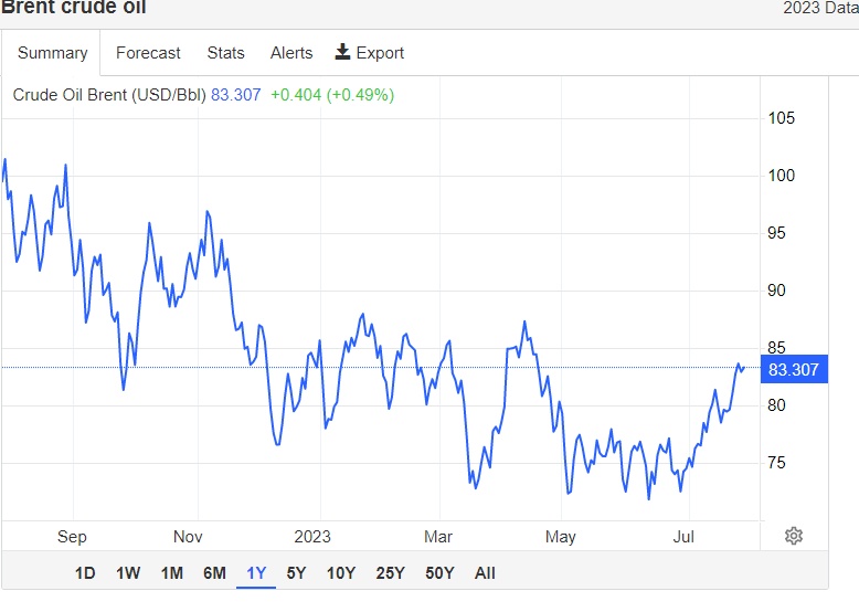 国际油价基准——布伦特原油价格在过去一个月上涨了约12%,至每桶83美元左右,欧佩克+以及沙特阿拉伯对产量的限制促使全球原油市场供应收紧,进而提振了今年以来持续低迷的油价。