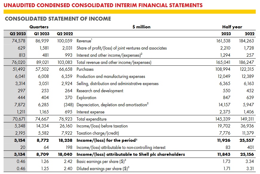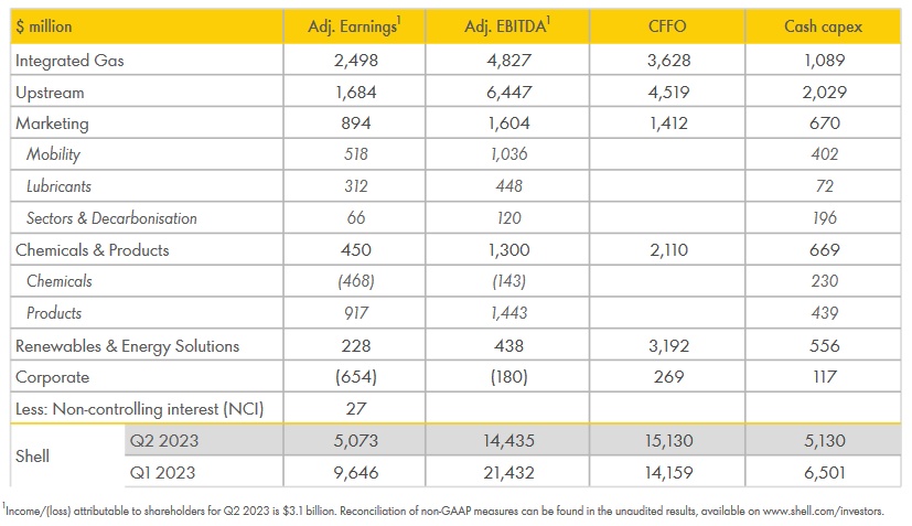 智通财经APP获悉,7月27日,壳牌(SHEL.US)公布了2023年第二季度财务业绩。财报显示,壳牌Q2调整后净利润为50.73亿美元,较上年同期创纪录的114.72亿美元下降58%,不及分析师平均预期的55.8亿美元。该公司表示,由于价格下跌,且“季节性因素和优化机会减少”,其综合天然气部门的盈利大幅下降。