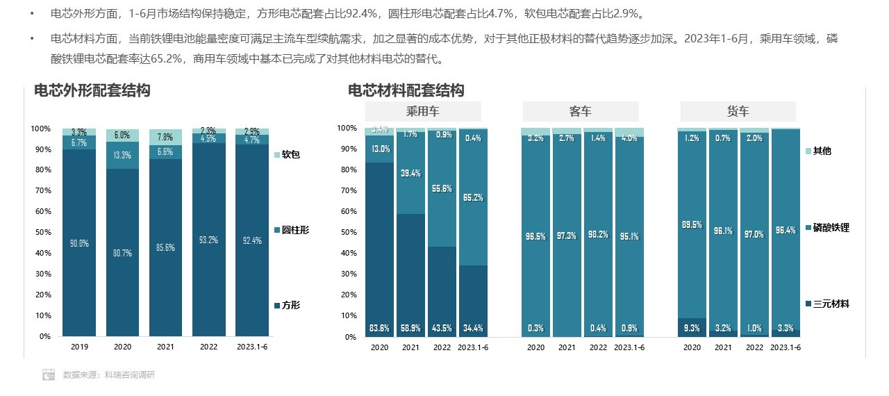 智通财经APP获悉,乘联会和科瑞咨询发布7月新能源汽车三电系统洞察报告。报告显示,6月新能源汽车动力电池装机量较上月增加5.5GWh。磷酸铁锂对三元电池的替代进程,在商用车领域基本已经结束,在乘用车领域正不断加深。电芯材料方面,当前铁锂电池能量密度可满足主流车型续航需求,加之显著的成本优势,对于其他正极材料的替代趋势逐步加深。2023年1-6月,乘用车领域,磷酸铁锂电芯配套率达65.2%,商用车领域中基本已完成了对其他材料电芯的替代。