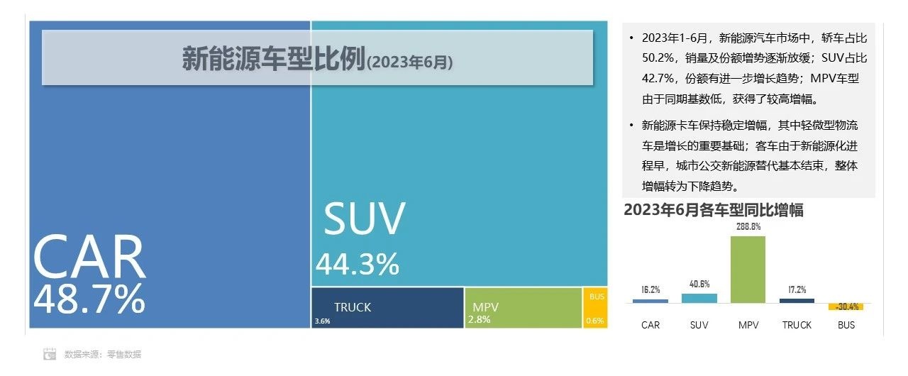 2023年6月,轿车占比48.7%,相比同期下降5个百分点;SUV、MPV份额升至44.3%和2.8%;客车、卡车份额分别为3.6%和0.6%。