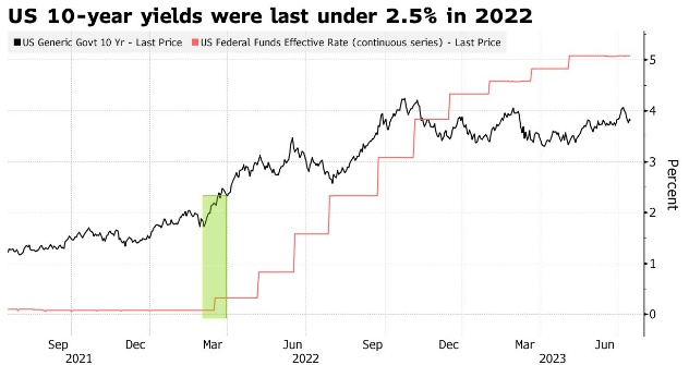 基准的10年期美国国债收益率已经从去年10月份的峰值下降了近半个百分点,至3.84%左右,有迹象表明美联储的加息活动可能即将结束。若10年期美国国债收益率下降150个基点,该收益率将降至2.34%左右,这将是自2022年初以来的最低水平。