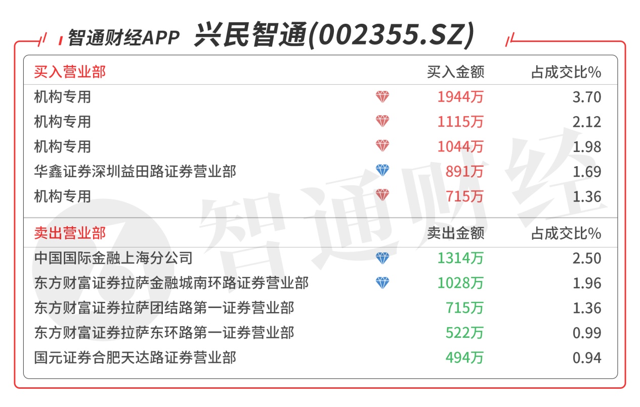 兴民智通(002355.SZ):受到众多机构青睐,今日共4个机构席位出现在龙虎榜单上,合计净买入4818万元,买四是知名游资的席位买入891万元,当日净买入2103万元,该股今日强势反包,持续上升需放量。