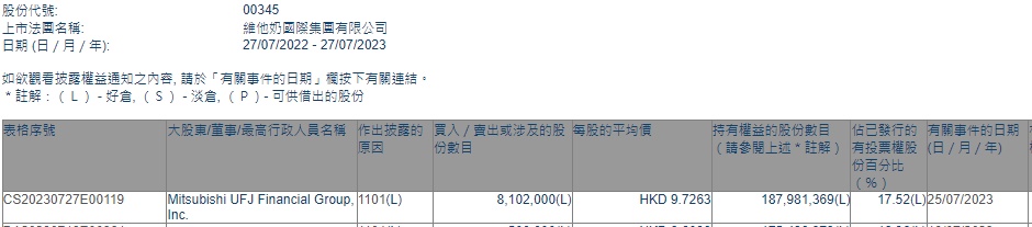 智通财经APP获悉,香港联交所最新资料显示,7月25日,三菱日联金融增持维他奶(00345)810.2万股,每股作价9.7263港元,总金额约7880.25万港元。增持后最新持股数目约为1.88亿股,最新持股比例为17.52%。