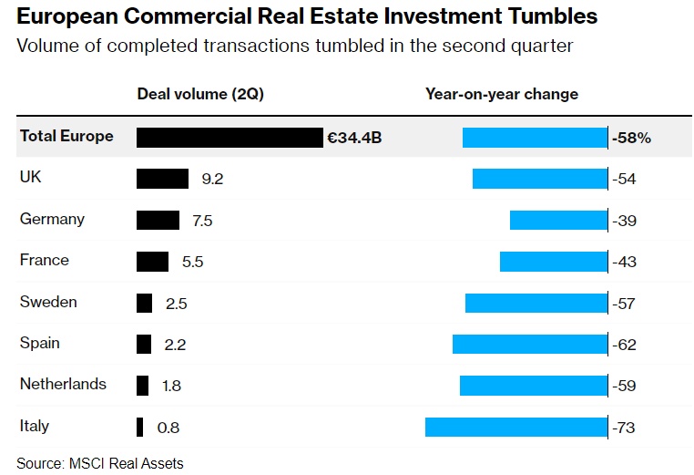 智通财经APP获悉,由于利率上升颠覆了欧洲的房地产市场,第二季度欧洲商业房地产交易额暴跌58%。根据MSCI Real Assets的数据,在截至6月份的三个月里,交易价值仅为344亿欧元(383亿美元),为2010年以来的最低水平。写字楼是受打击最严重的主要细分市场,交易暴跌68%,而酒店最稳定,交易下降了36%。