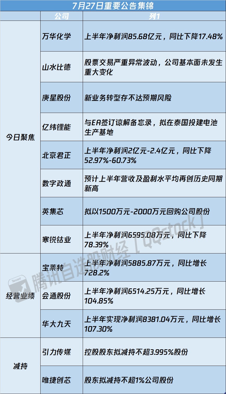 1、万华化学:上半年净利润85.68亿元,同比下降17.48%