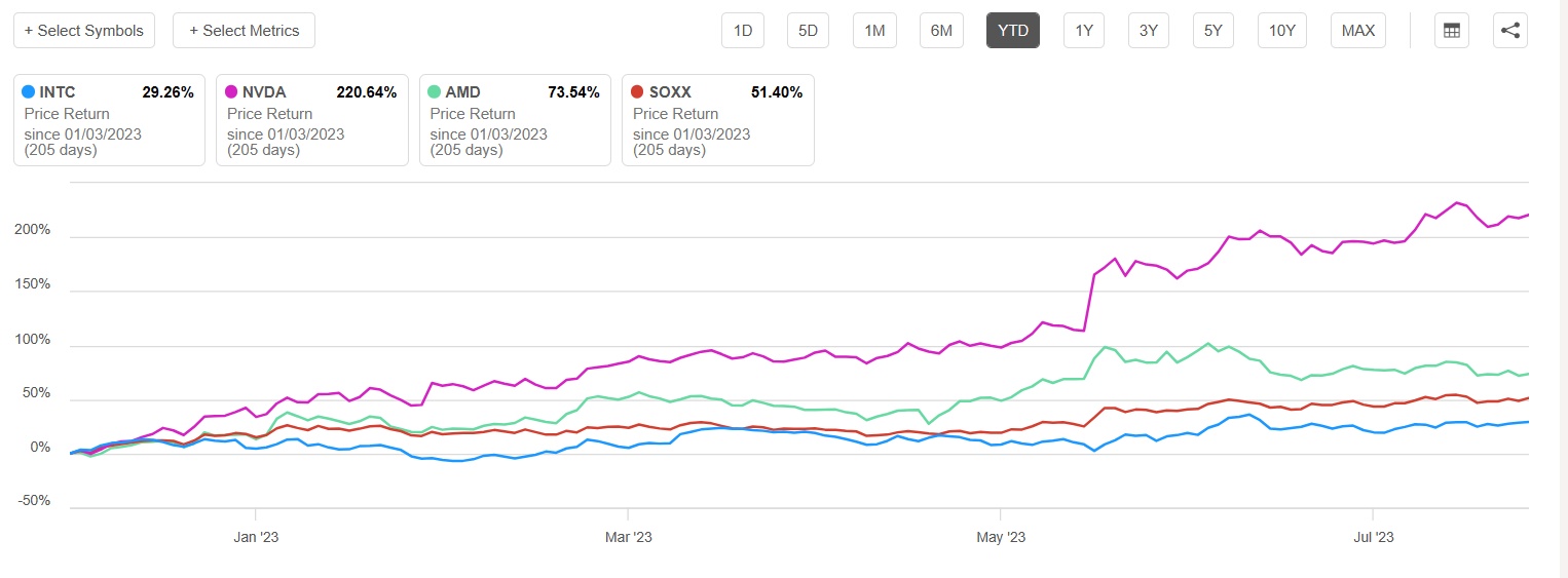 尽管截至周四收盘,英特尔股价今年已累计上涨31%,但表现远远逊于芯片股涨势。堪称全球芯片股基准的费城半导体指数在2023年涨幅超过50%,英特尔最大竞争对手AMD(AMD.US)和英伟达(NVDA.US)在年内的涨幅高达惊人的70%和220%。