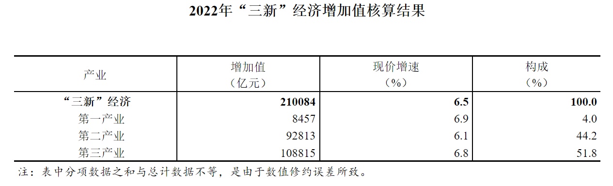 智通财经APP获悉,7月27日,国家统计局数据显示,经核算,2022年我国“三新”经济增加值为210084亿元,比上年增长6.5%(未扣除价格因素,下同),比同期国内生产总值(GDP)现价增速高1.2个百分点;相当于GDP的比重为17.36%,比上年提高0.11个百分点。