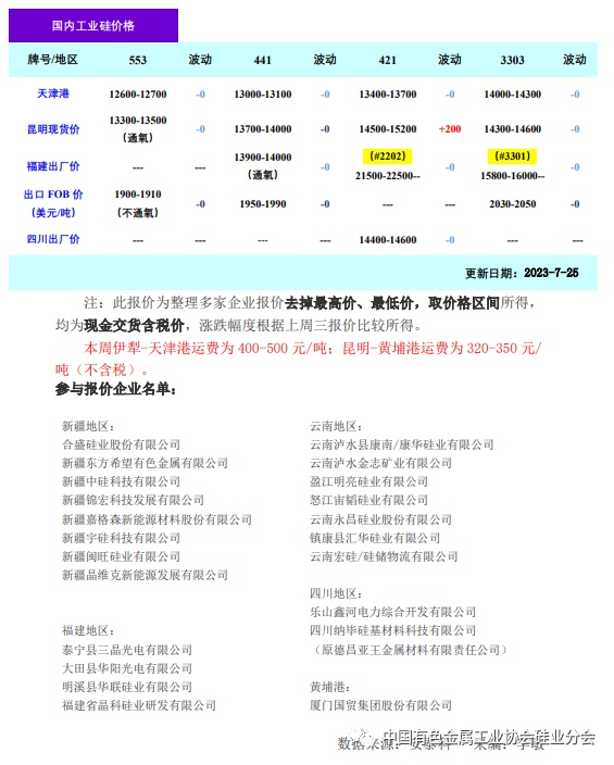 智通财经APP获悉,硅业分会发文称,本周国内工业硅现货价格保持稳定。其中,除云南地区化学级工业硅价较上周上涨200元/吨,主流价格在14500-15200元/吨以外,其他现货硅价保持平稳。期货盘面,主力合约工业硅2309盘面价格小幅上涨,7月25日收盘于13555元/吨,较7月18日收盘价13325元/吨同比上涨1.73%。