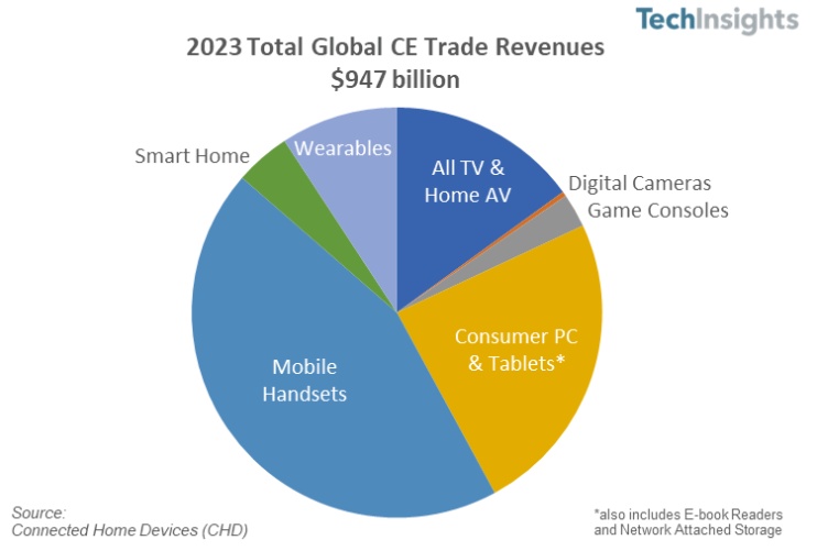 TechInsights指出,增长将主要来自游戏(+38%)、智能家居(+10%)和可穿戴设备(+12%),以及移动设备(+4%),移动设备仍然是最大的产品类别,占整个电子产品市场的44%。
