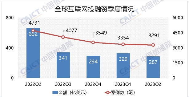 全球互联网投融资低位徘徊。2023Q2,全球互联网投融资案例数环比下跌1.9%,同比下跌30.4%;披露的金额环比下跌12.6%,同比下跌56.6%。