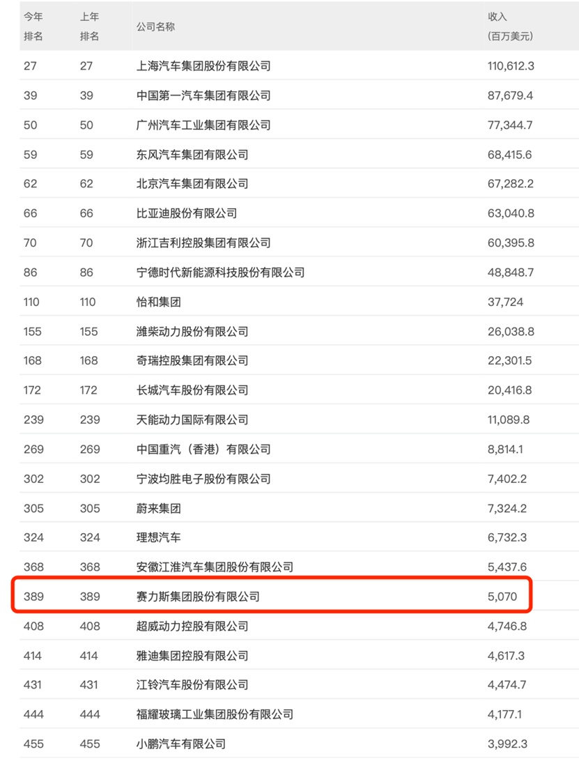 智通财经APP获悉,日前,2023年《财富》中国500强榜单发布,赛力斯汽车(601127.SH)首次上榜,位列第389位。据悉,2023年《财富》中国500强榜单采用与《财富》世界500强一脉相承的制榜方法,同时包括了上市和非上市企业,共有24家车辆与零部件公司入围。