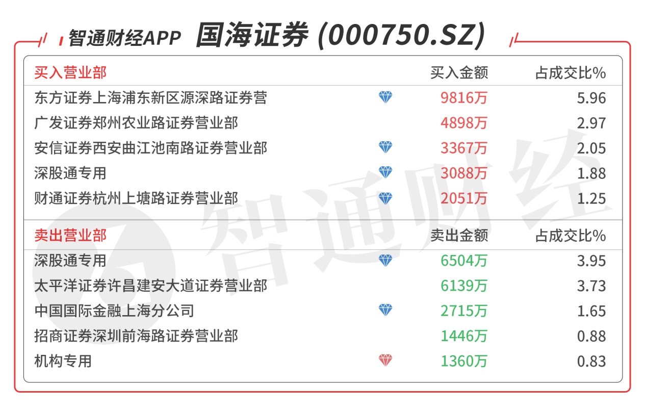 国海证券(000750.SZ):龙虎榜阵容豪华,机构与游资出现分歧,机构席位卖出1341万元,深股通对倒卖出3417万元,买一是顶级游资小鳄鱼的席位买入9814万元,买三是顶级游资方新侠的席位买入3367万元,当日买入5538万元,该股今日反包,强势特征明显。