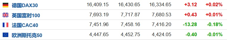 2.截至发稿,德国DAX指数涨0.02%,英国富时100指数涨0.01%,法国CAC40指数跌0.18%,欧洲斯托克50指数跌0.01%。
