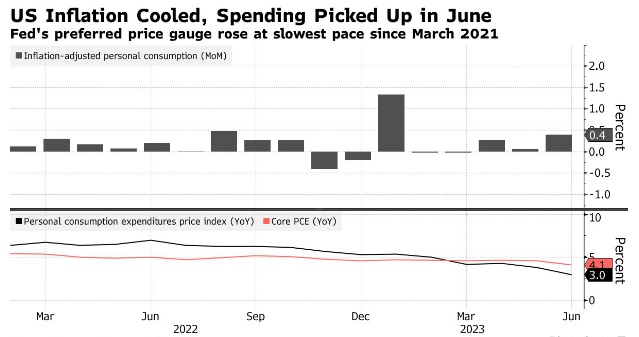 智通财经APP获悉,美国商务部周五公布的数据显示,美国6月PCE物价指数同比上升 3%,与预期一致,前值3.80%。美国6月核心PCE物价指数同比上升 4.1%,预期4.20%,前值4.60%,为2021年9月以来最小增幅。数据显示,美国主要通胀指标继续降温,6月份消费者支出回升,在第三季度到来之前增强了经济增长势头。