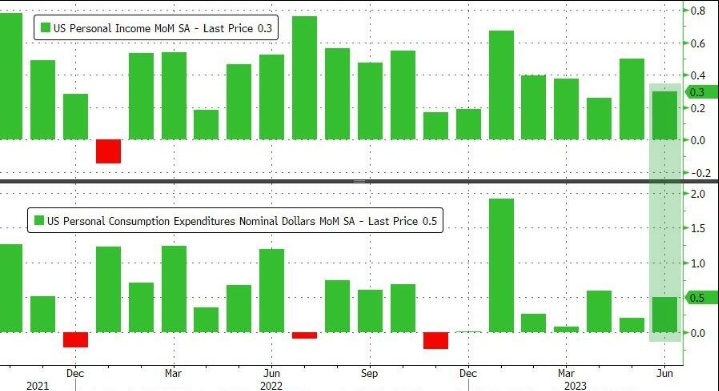 美国6月个人收入环比增长0.3%(弱于预期的0.5%),而支出增速超过收入增速(环比增长0.5%,好于预期的0.1%)。按同比计算,美国6月个人收入和支出增长基本相等。