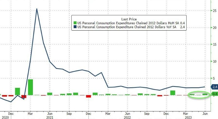 扣除通货膨胀因素后,美国6月份实际个人消费支出连续第三个月增长,同比上升2.4%;环比上升0.4%,是自1月份以来的最大增幅,预期0.30%,5月为保持不变。