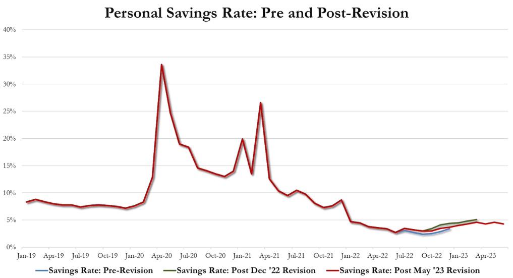 经通胀调整后,商品支出环比上升0.9%,为年初以来最大增幅。服务业支出环比上升0.1%。作为消费者支出主要支撑的实际可支配收入上升0.2%。未经价格变动调整的工资和薪金增长0.6%,为年初以来的最大涨幅。因此,支出的增长意味着储蓄的放缓,储蓄率降至4.3%,这是自1月份以来的最低水平。