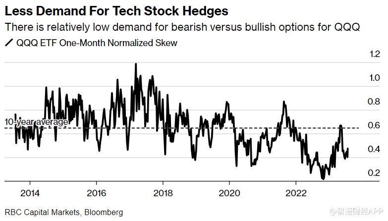 与此同时,大量的对冲指标显示对下行保护的需求很低。RBC Capital Markets表示,对Invesco QQQ Trust Series 1和SPDR S&P 500 ETF Trust的看跌期权保费处于十年来的最低水平。