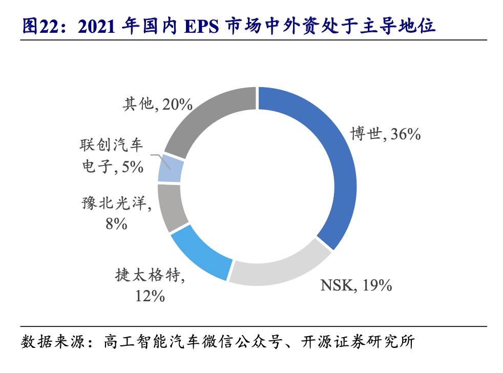 需要注意的是,目前国内 EPS 市场由外资品牌主导,市场格局稳固。据统计,2021年博世、NSK、采埃孚合计占据了67%的市场份额。相较之下,国产 EPS 供应商份额相对较小。