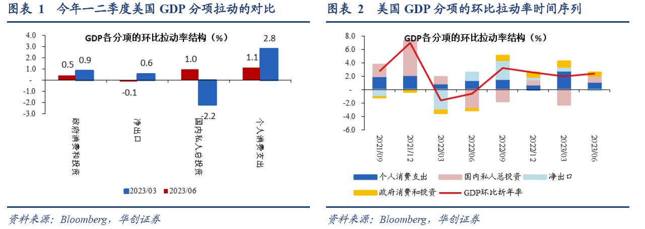 第一,消费依旧具有韧性,对GDP的拉动最大。个人消费支出增速从4.2%下滑至1.6%,对GDP的拉动从2.8降至1.1个百分点。从两个角度来看,消费支出依然较强。一是,增速明显高于市场预期的1.2%;二是,在今年1季度高基数效应下,1.6%的增速并不算低,两个季度平均是2.9%,好于2015-2018年均值的2.4%。消费韧性的背后,是超额储蓄持续消耗、就业市场紧张与通胀回落带来的实际收入回升以及股市上涨的财富效应。