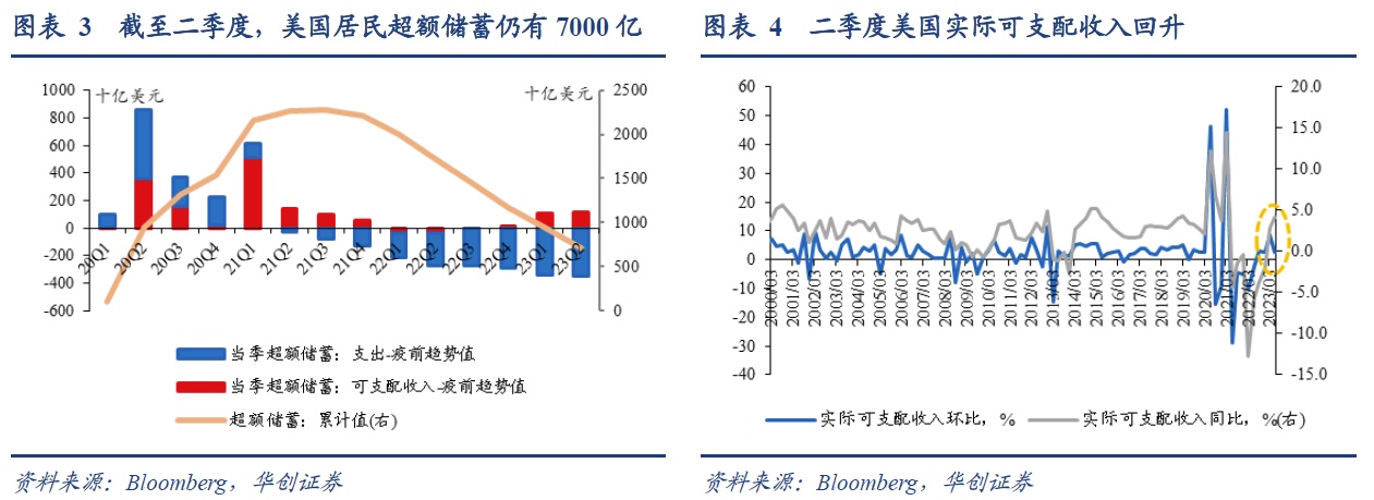总结来看,二季度美国经济强劲增长,主要有三个因素:第一,消费依旧具有韧性,对GDP的拉动最大。个人消费支出增速从4.2%下滑至1.6%,对GDP的拉动从2.8降至1.1个百分点。但从两个角度来看,消费支出依然较强。一是,增速明显高于市场预期的1.2%;二是,在今年1季度高基数效应下,1.6%的增速并不算低,两个季度平均是2.9%,好于2015-2018年均值的2.4%。消费韧性的背后,是超额储蓄、实际收入回升以及财富效应。二季度,美国居民超额储蓄从9400亿降至7050亿美元,其消耗速度依然维持着21年下半年以来的斜率,是消费韧性最核心的支撑。劳动力市场强劲增强了名义薪资粘性,叠加通胀的下行,二季度,实际可支配收入同比从2.9%回升至4.1%(2015-18年为3%),环比增速虽从8.5%回落至2.5%,但并未明显低于疫前中枢(2015-18年为2.9%)。最后,股市上涨也为居民消费提供了财富效应,二季度美国三大股指持续上涨,年初至今,标普500指数上涨19.3%,纳指上涨36.8%,道指上涨7%。