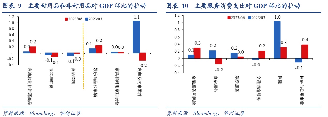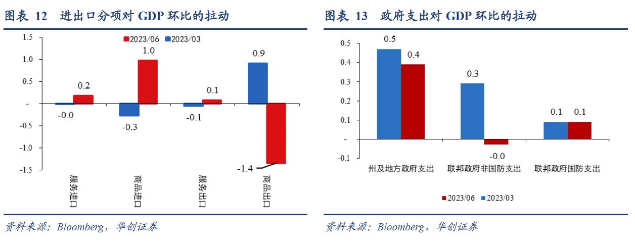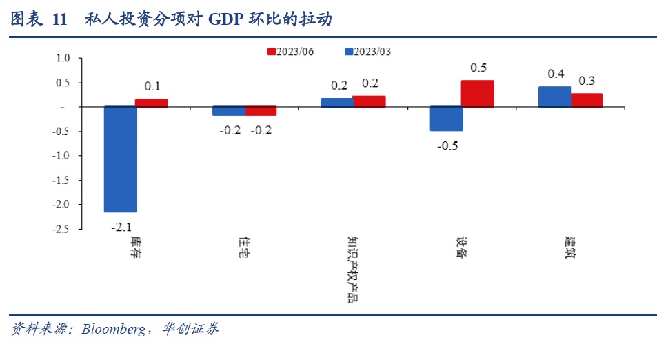 商品消费增速0.7%,拉动GDP增长0.16个百分点;较一季度6%的增速大幅下行,汽车及零部件消费支出下降是主要拖累因素。二季度,耐用品消费支出增速从16.3%回落至0.4%,其中,汽车及零部件消费支出下降7.5%,而一季度则增长了45.2%;家具和家用设备、娱乐商品和车辆、其他耐用品消费支出分别增长1.2%、10%、0%,前值分别为1.6%、4%。主要受汽油和其他能源品消费支出提速(2.6%,前值13.1%)影响,耐用品消费支出增速从0.5%升至0.9%。服务消费支出增速从3.2%下滑至2.1%,拉动GDP增长0.95个百分点;医疗服务支出增速回落、食宿服务支出下降,是主要拖累因素。金融服务和保险(5.9%,前值2.1%)支出增速上行,住房和公用事业(3.2%,前值-0.7%)、交运服务(9.8%、前值-0.6%)支出由降转增,医疗保健(2.8%,前值10%)、娱乐消费(1.8%,前值6.1%)支出增速回落,食宿(-2.9%,前值4.5%)、其他服务(-0.2%,前值3.6%)支出由增转降。