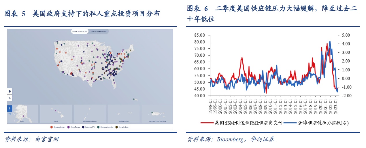 第二,私人非住宅投资增长强劲,对GDP的拉动基本持平于消费。非住宅投资增速从0.6%回升至7.7%,对GDP的拉动从0.1升至1个百分点。非住宅投资的增长,主要来源于制造业建筑投资(94%,前值77.9%)、信息处理设备(1.4%,前值-6.1%)和运输设备(55.8%,前值-24.1%)和知识产权(3.9%,前值3.1%)投资,背后或是美国政府对半导体和新能源等行业的支持逐步显现(美国救济计划、芯片法案、通胀削减法案等,在拜登政府支持下,私人企业21年至今已宣布2310亿的半导体和电力投资、1330亿的电车和电池投资、1030亿的清洁能源投资、190亿的生物制造投资)、供应链的缓解(二季度全球供应链压力指数和美国PMI供应商交付指数已回到过去二十年最低水平)。