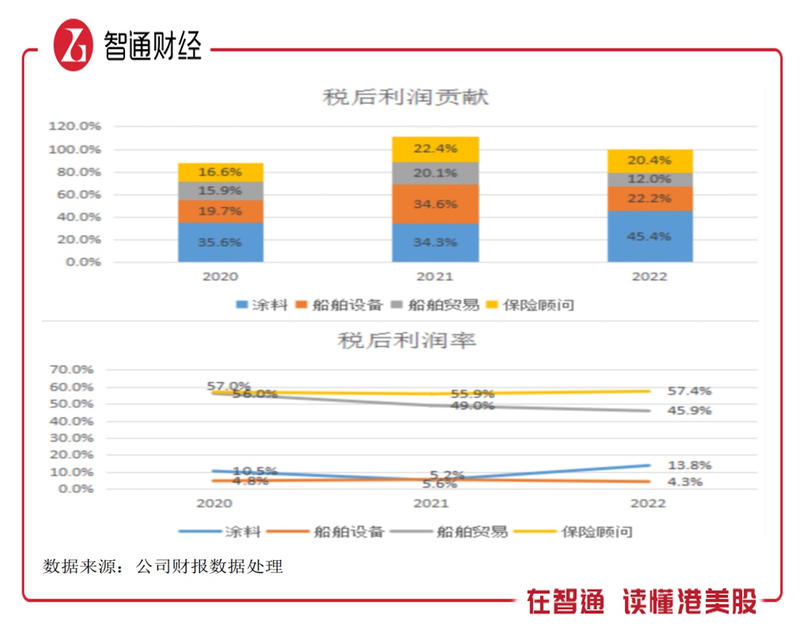 航运服务贡献98%的税后利润,涂料和船舶设备虽然占收入大头,但税后利润贡献远低于收入贡献,往年均在70%以下,主要为利润率较低,前者税后利润率于2022年大幅提升,为13.8%,后者则在4-6%窄幅波动。反观船舶贸易和保险顾问业务,业务收入份额一成,但利润贡献超过三成,税后利润率均超过45%,其中保险顾问达到57.4%。保险顾问经营水险及非水险的保险及再保险中介业务,在场景资源优势下,每年业绩都在提升,不过收入份额很小,对业绩不构成重大影响。