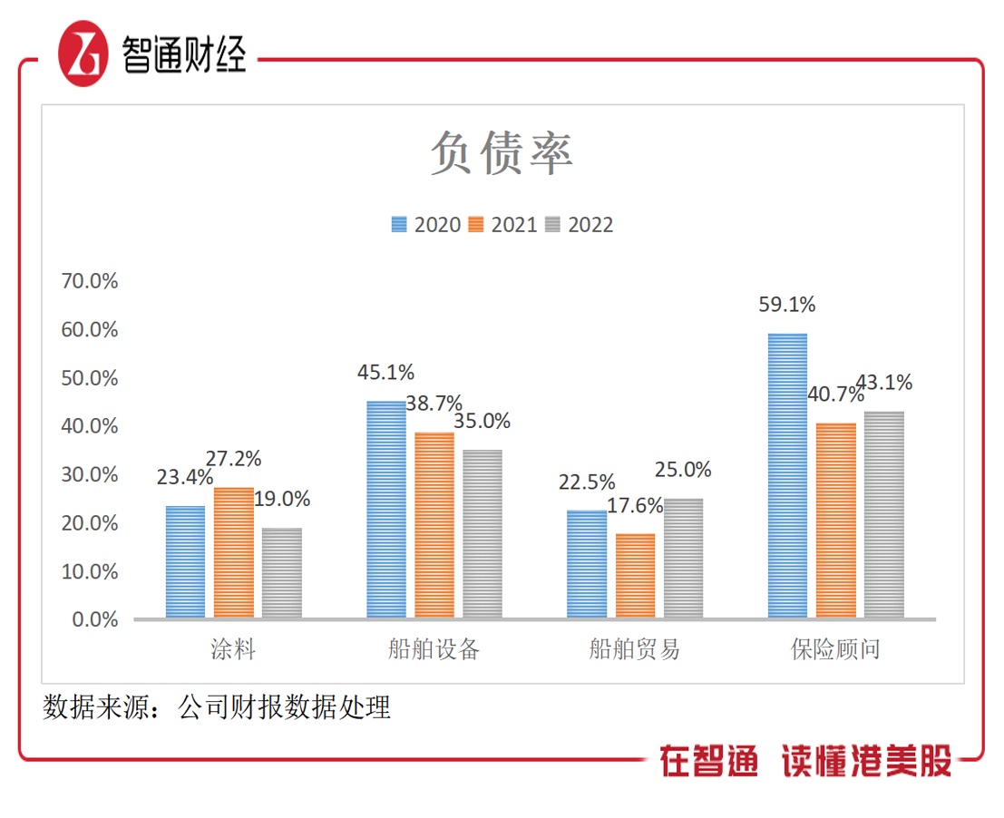 中远海运国际财务非常健康,手中握有充裕的现金流,2022年末,该公司账上现金高达59亿港元,占比流动资产及总资产达75%及64%,往年占比均稳定维持在高位,而整体负债率非常低,为12%,且基本没有有息债。从业务负债率看,核心的涂料及船舶设备负债率低位且持续下降,其中涂料业务于2022年仅为19%。
