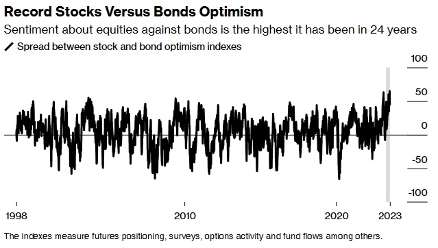智通财经APP获悉,去年12月,所有人都在谈论2023年将是“债券年”。在过去的这个冬季的一两个短暂时刻,对经济前景的悲观情绪让这种论调看起来是正确的。不过,目前对股票的需求飙升已经在全球范围内引发了一场疯狂的反弹,而且有迹象表明这种涨势可能远未结束,这使得投资者对股票相对于债券的乐观程度达到了有记录以来的最高水平。