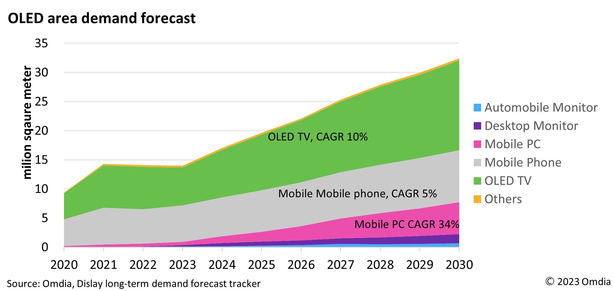 智通财经APP获悉,Omdia《显示面板长期需求预测追踪报告》的最新研究表明,从2022年到2030年,OLED显示面板的需求面积复合年增长率(CAGR)将达到11.0%。Omdia显示产业研究的高级首席分析师Ricky