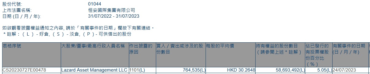 智通财经APP获悉,香港联交所最新资料显示,7月24日,Lazard Asset Management LLC增持恒安国际(01044)76.4535万股,每股作价30.2648港元,总金额约为2313.85万港元。增持后最新持股数目为5869.35万股,最新持股比例为5.05%。