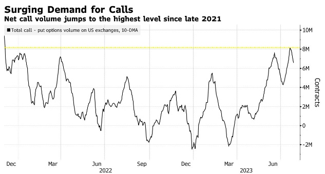 在期权市场,看涨期权更受欢迎,交易员倾向于股市反弹的反应,部分原因是人工智能热潮推动了科技股的上涨。数据显示,在美国各交易所,看涨期权交易量的10天移动水平超过了800多万份合约,这是自2021年12月以来的最高水平。