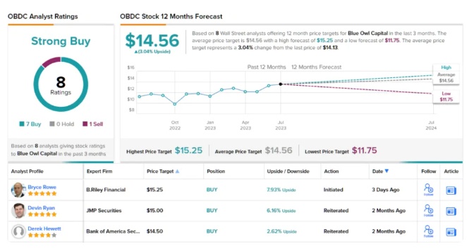 顶级分析师布莱斯·罗认为Blue Owl的低股价、稳定的股息和强劲的业务组合给其留下了深刻印象。罗称:“我们认为风险/回报状况有利于回报,因为我们认为估值折扣的下行潜力有限,有利的盈利环境,健康的股息覆盖范围,以及Blue Owl直接贷款平台的规模和规模,我们认为这应该使公司能够利用从更传统的融资来源转向私人债务的持续转变。”根据预计每股1.59美元的定期股息和补充股息(2023年第三季度至2024年第二季度),Blue Owl Capital的股息收益率约为11%,资产净值(NAV)为92%。”